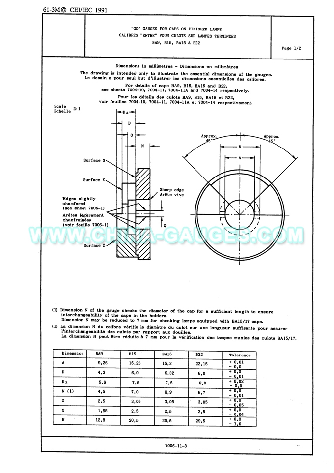 (1) Dimension N of the gauge checks the diameter of the cap for a sufficient length to ensure interchangeability of the caps in the holders.